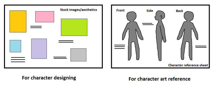 - at least provide a Pinterest board, or compilation of photos (color palette, aesthetic, accessories/weapons) for your character thememore samples are at Mimo's Ko-fi Gallery*photo below indicates the difference of references for character design and for an illustration, if you wish to commission an illustration but can only use stock/aesthetic images it will require an additional for the character design (credits @xenvita on twitter for the image below)